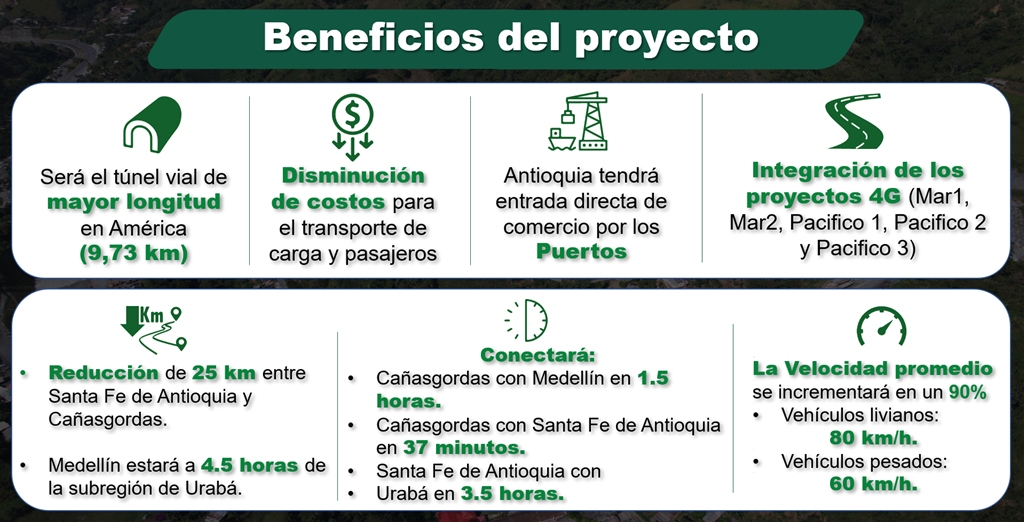 La totalidad del proyecto tiene una longitud aproximada de 39.5 kilómetros de vía nueva, su diseño permitirá alcanzar una velocidad de 80 kilómetros por hora, permitiendo una disminución en tiempos de recorrido hacia Urabá desde Medellín en 4.5 horas; el proyecto será un referente para la ingeniería por tener el túnel vial de mayor longitud en América.